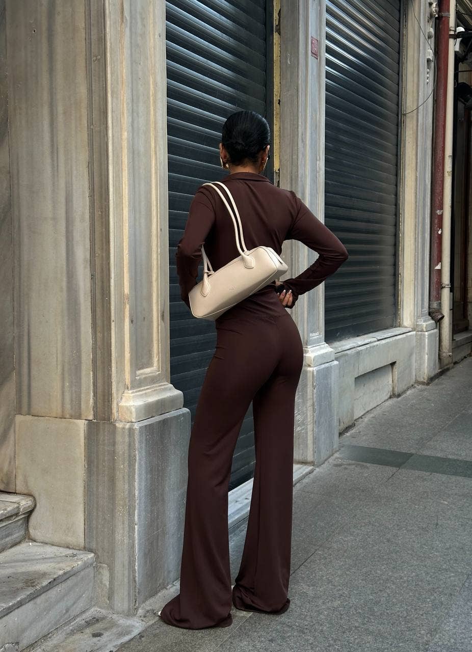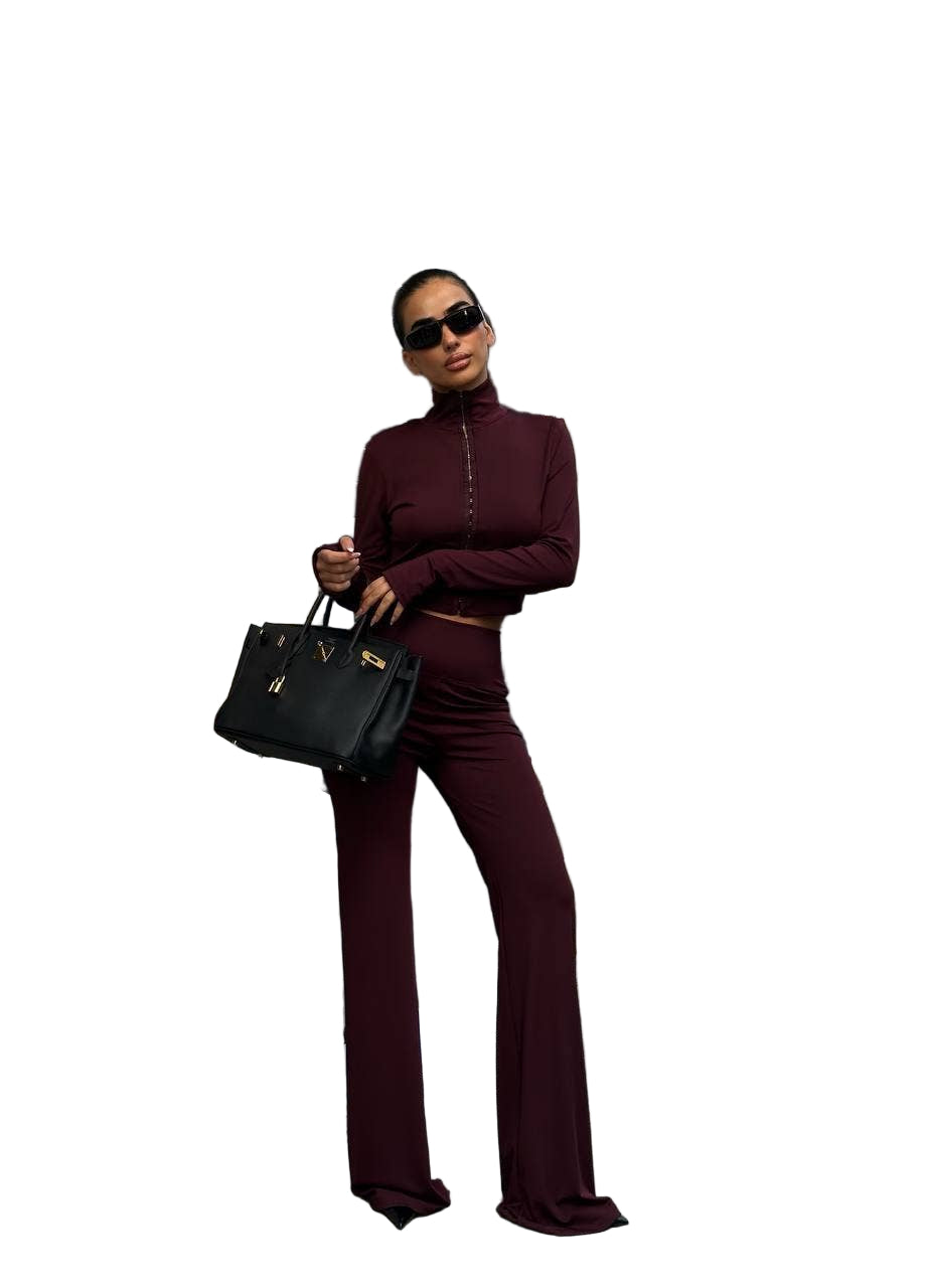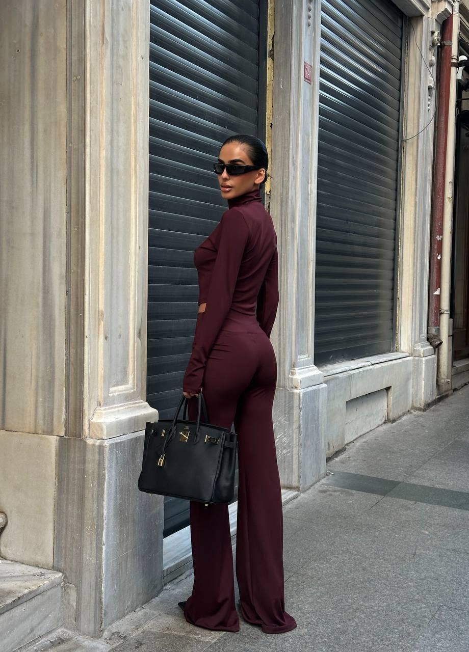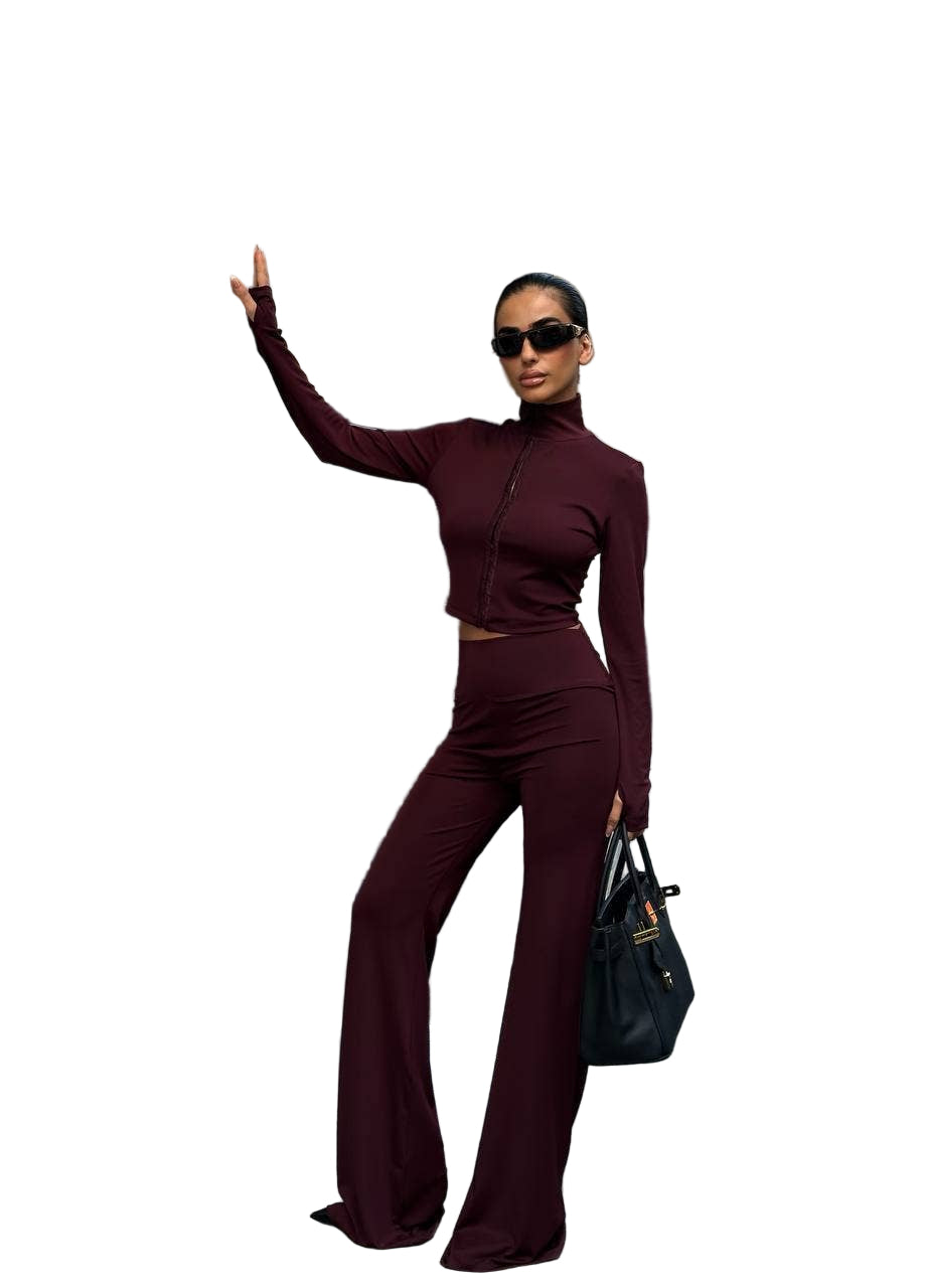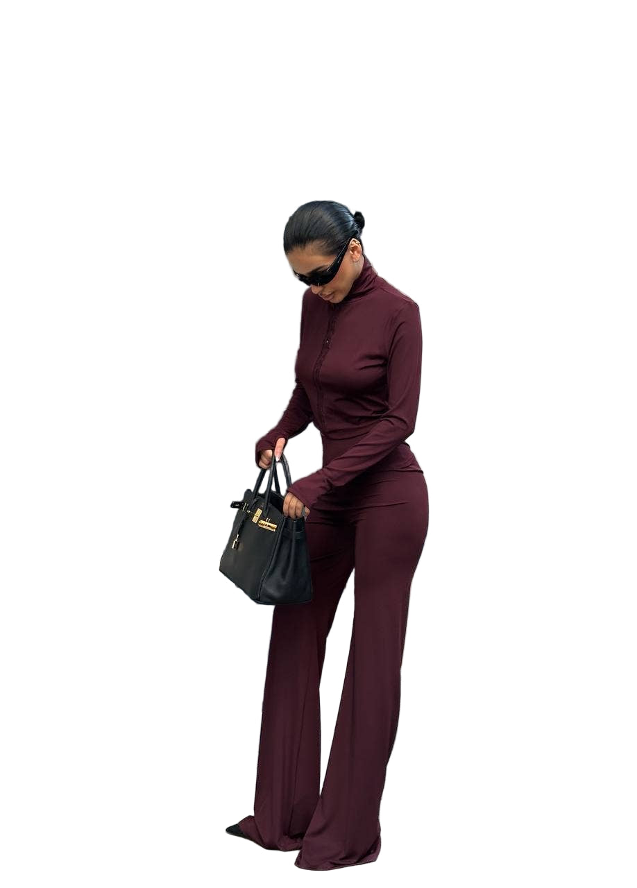 Introducing the Sculpt Luxe Zip-Up Jumpsuit, a versatile fall and winter essential that combines contemporary design with flattering silhouettes. Crafted from premium stretch polyester-spandex, this bodycon piece features a mock neckline, long sleeves with thumbhole accents, and a front zipper for customizable styling. The flared leg creates elegant elongation while seam detailing sculpts and defines. Soft compression offers flexible comfort whether you're heading out for the evening or casual brunch. Style zipped for polished sophistication or partially open for an edgier vibe—pair with heels or sneakers for effortless city-chic appeal. Available in rich Burgundy.
