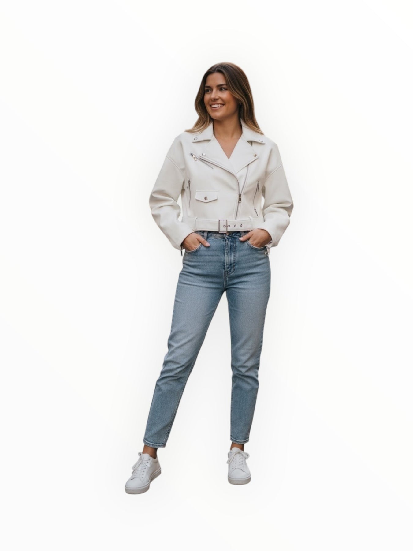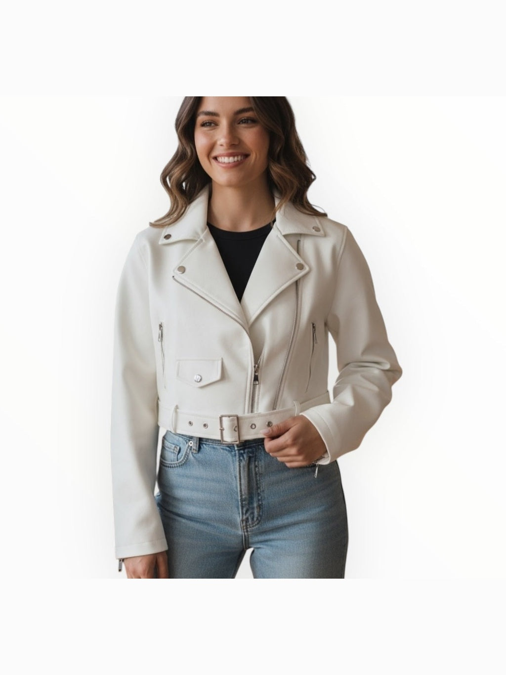 This sleek white moto jacket is made of pleather and features a front zipper and belt closure. Perfect for any fall occasion, it adds a cool and stylish touch to your outfit.