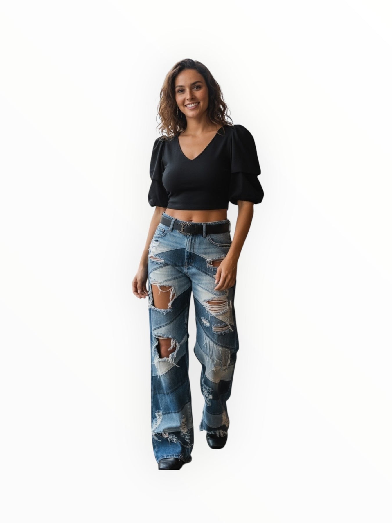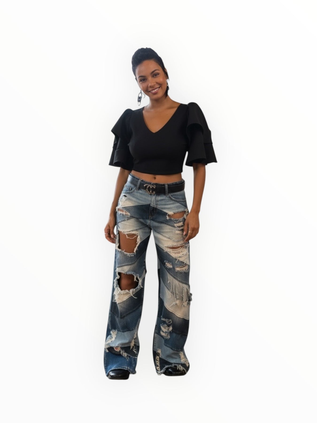 These high waisted jeans are both functional and fashionable, boasting a unique patchwork design and distressed features. With a fitted waist and multiple panels, these flare fit jeans make a bold statement.