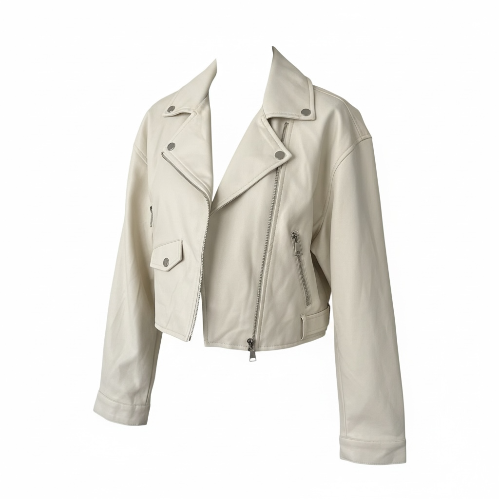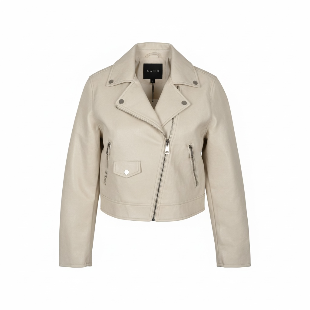 This sleek white moto jacket is made of pleather and features a front zipper and belt closure. Perfect for any fall occasion, it adds a cool and stylish touch to your outfit.