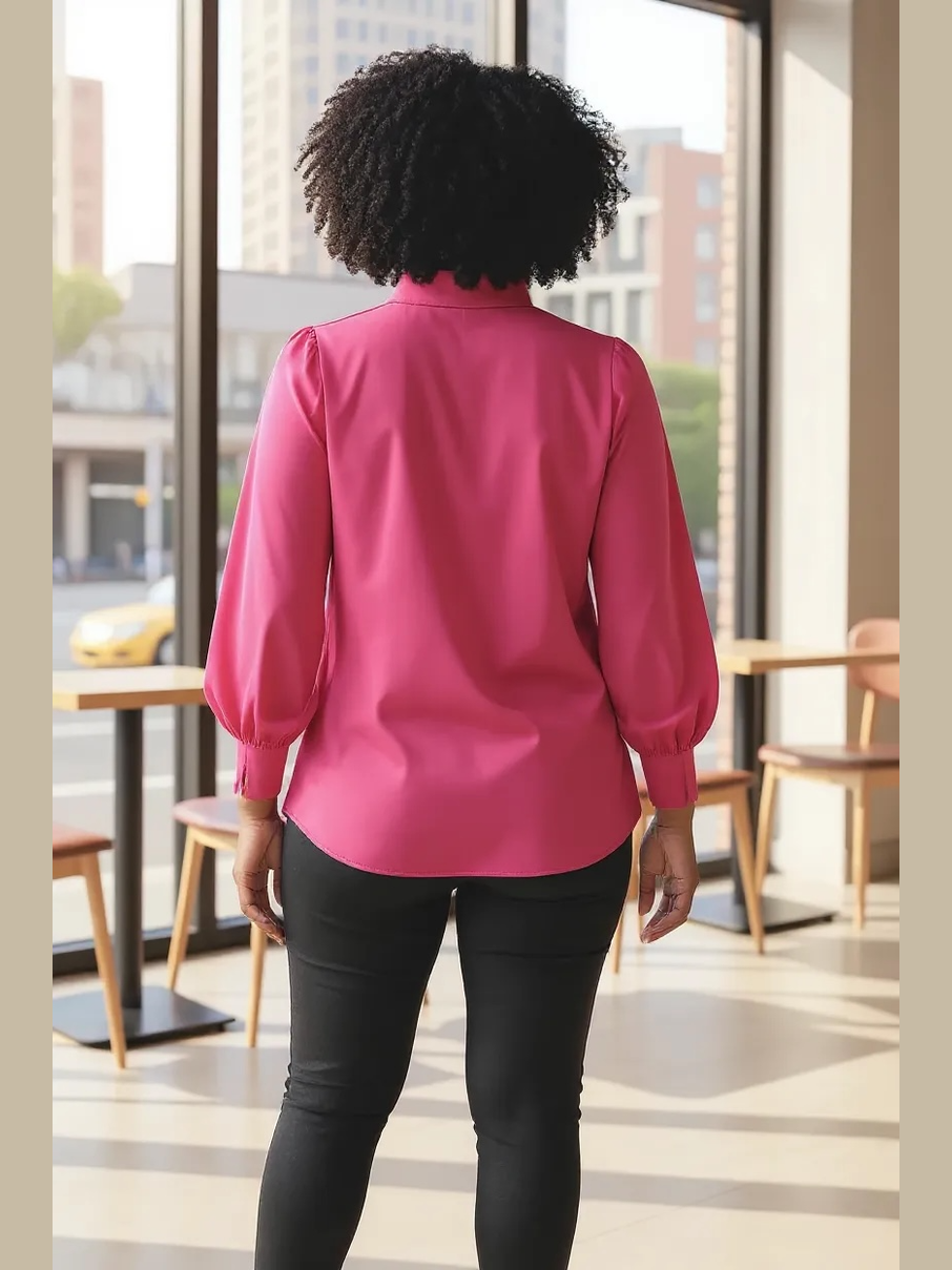 This shirt has wide ballon sleeves and can be worn tucked in our outside. It is silky and a vibrant color that stands out