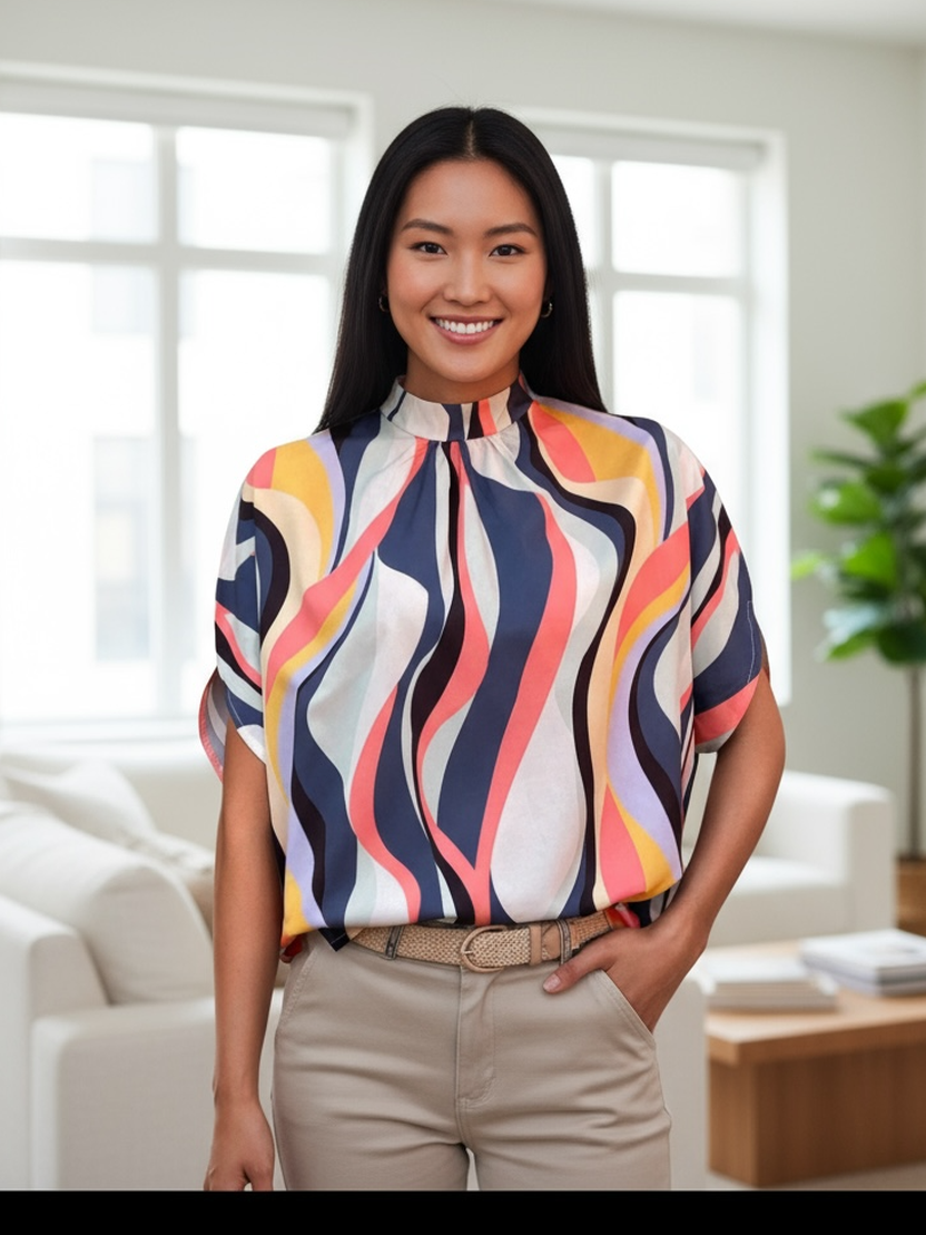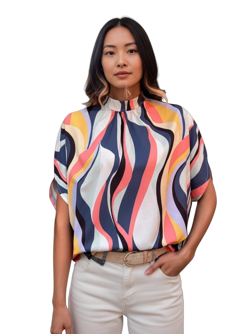Dale un toque de elegancia a tu armario con esta blusa de cuello alto. Con un elegante diseño de alas y un lazo en la espalda para un ajuste seguro, esta blusa es imprescindible para cualquier persona a la moda. ¡Luce estilo y comodidad todo el día!