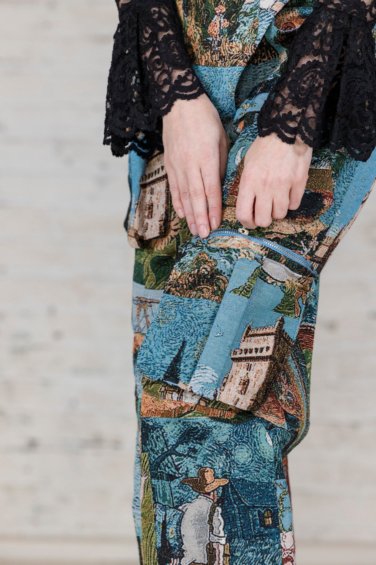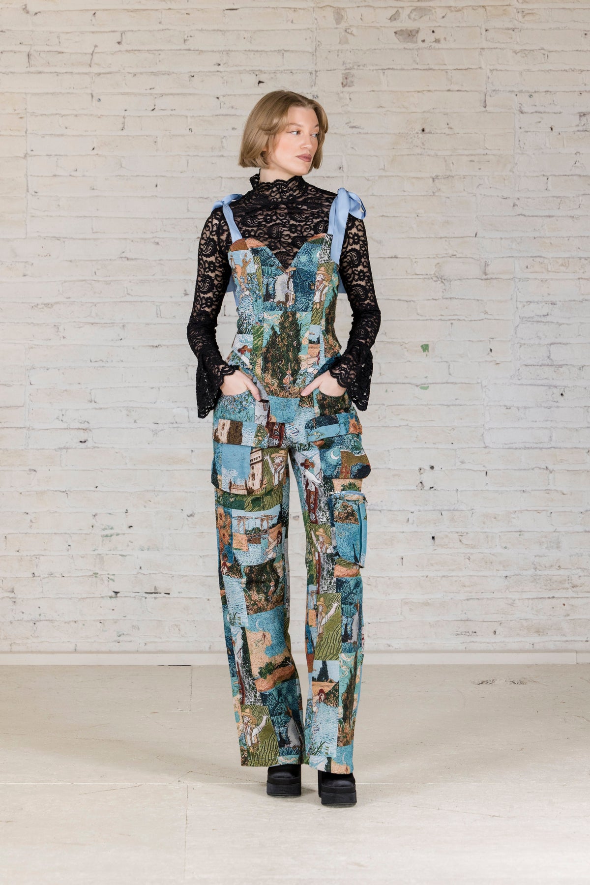 Top corsé sin tirantes multicolor con pantalón a juego con cierre de botón.
