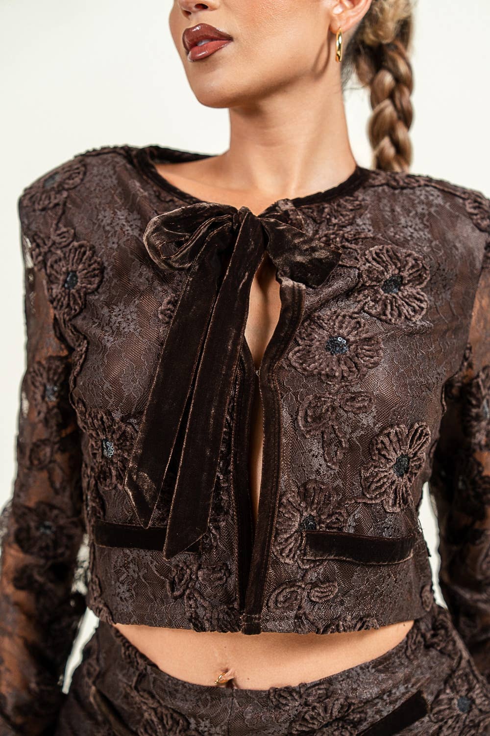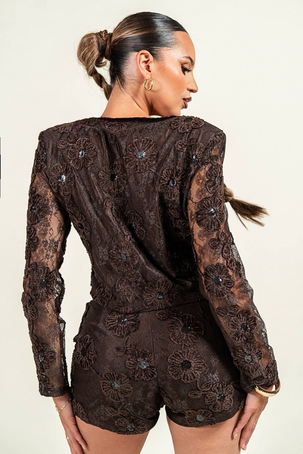Elevate your wardrobe with this sophisticated Lace Jacket & Short Set, featuring intricate floral embroidery that commands attention. The delicate lace construction offers a refined aesthetic perfect for evening events, upscale gatherings, or fashion-forward occasions. Crafted entirely from premium polyester with a fully lined interior, this set delivers both comfort and durability while maintaining its elegant drape and structure. The coordinated jacket and shorts combination provides versatile styling options—wear them together for a cohesive look or separate the pieces to create multiple outfits. The lining ensures a smooth, comfortable fit against the skin, while the quality construction promises longevity through repeated wear. Imported for discerning fashion enthusiasts who appreciate meticulous craftsmanship. Model is 5'8" wearing a Small.