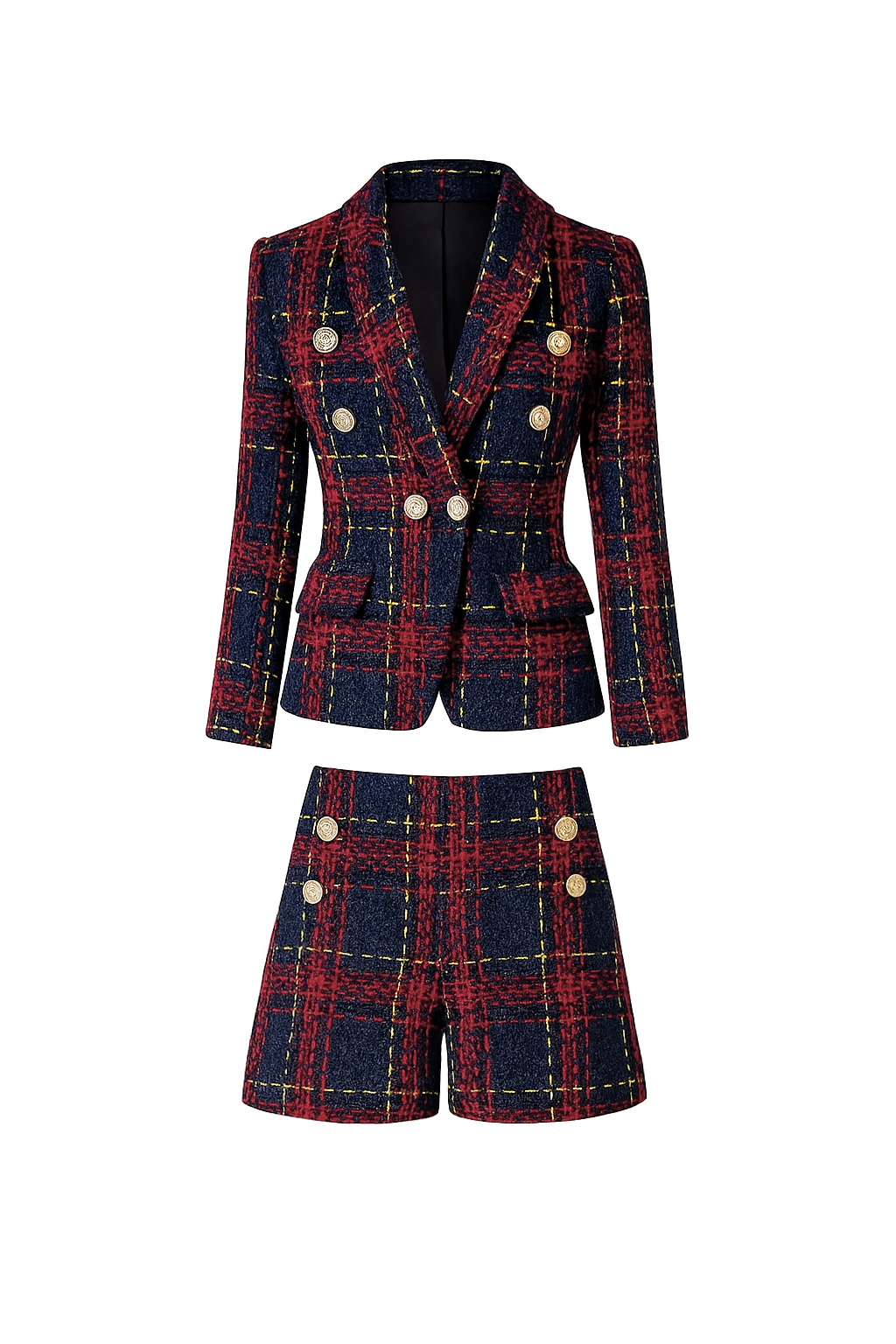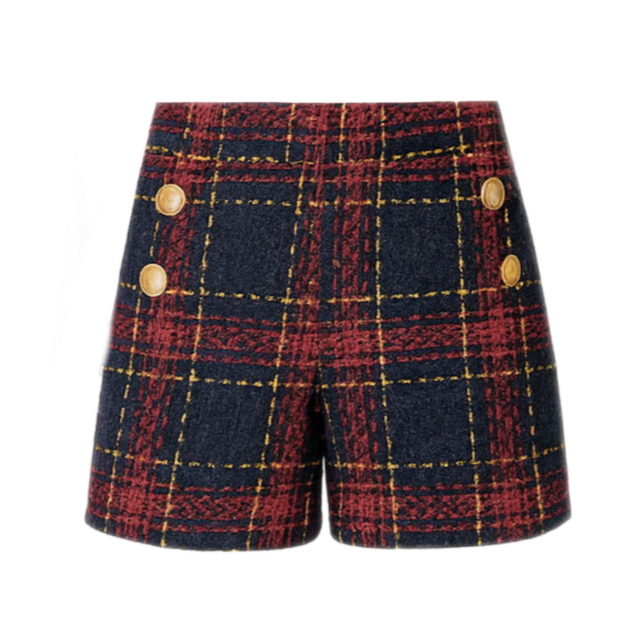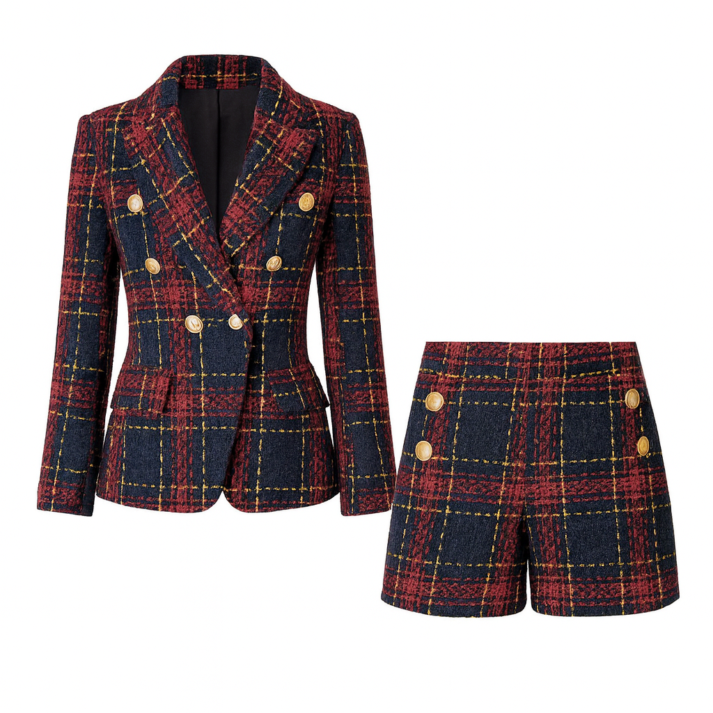 Elevate your seasonal style with this sophisticated tweed blazer and shorts ensemble. The tailored jacket showcases a streamlined silhouette with reinforced shoulders and timeless plaid detailing, while the coordinating high-waisted shorts create a polished, put-together aesthetic. Constructed from premium tweed, this set delivers both structure and comfort across professional settings, weekend outings, and everyday wear. Whether layered for office environments or styled for casual occasions, this pairing brings refined elegance and understated confidence to your wardrobe.
